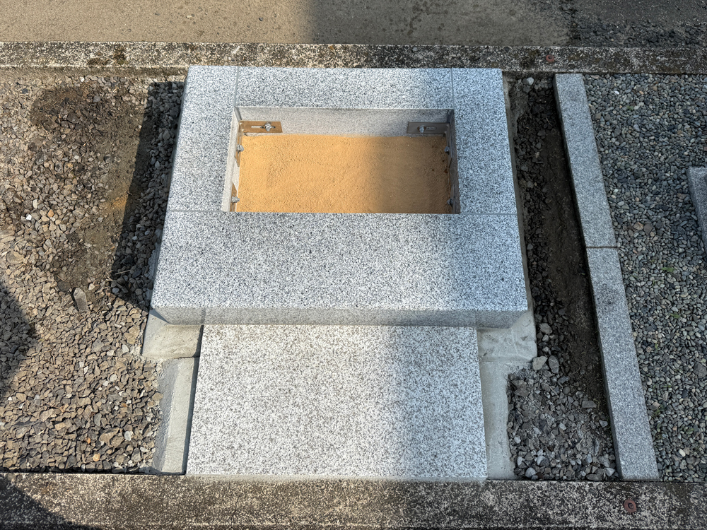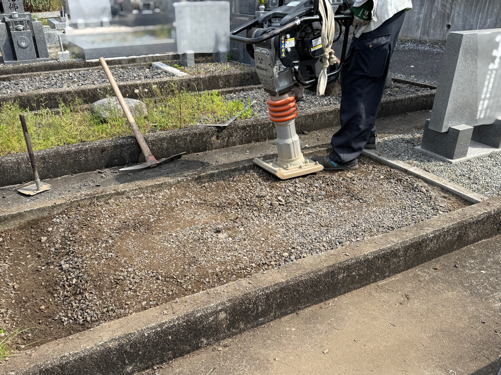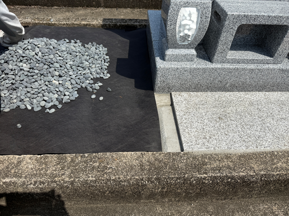 墓域の余剰部分は防草シートを敷設後に那智石を敷くことで、草が生えにくい施工をしております。